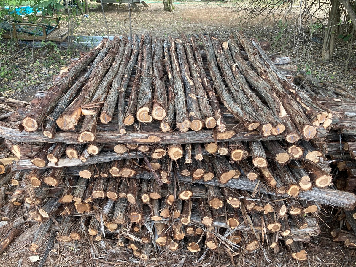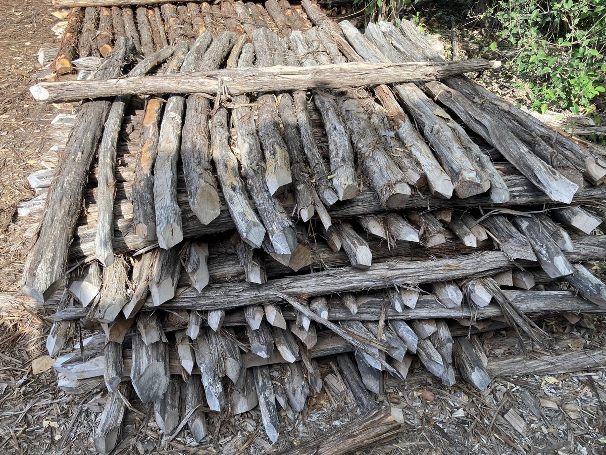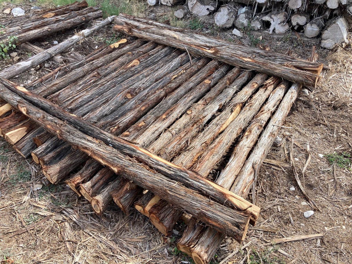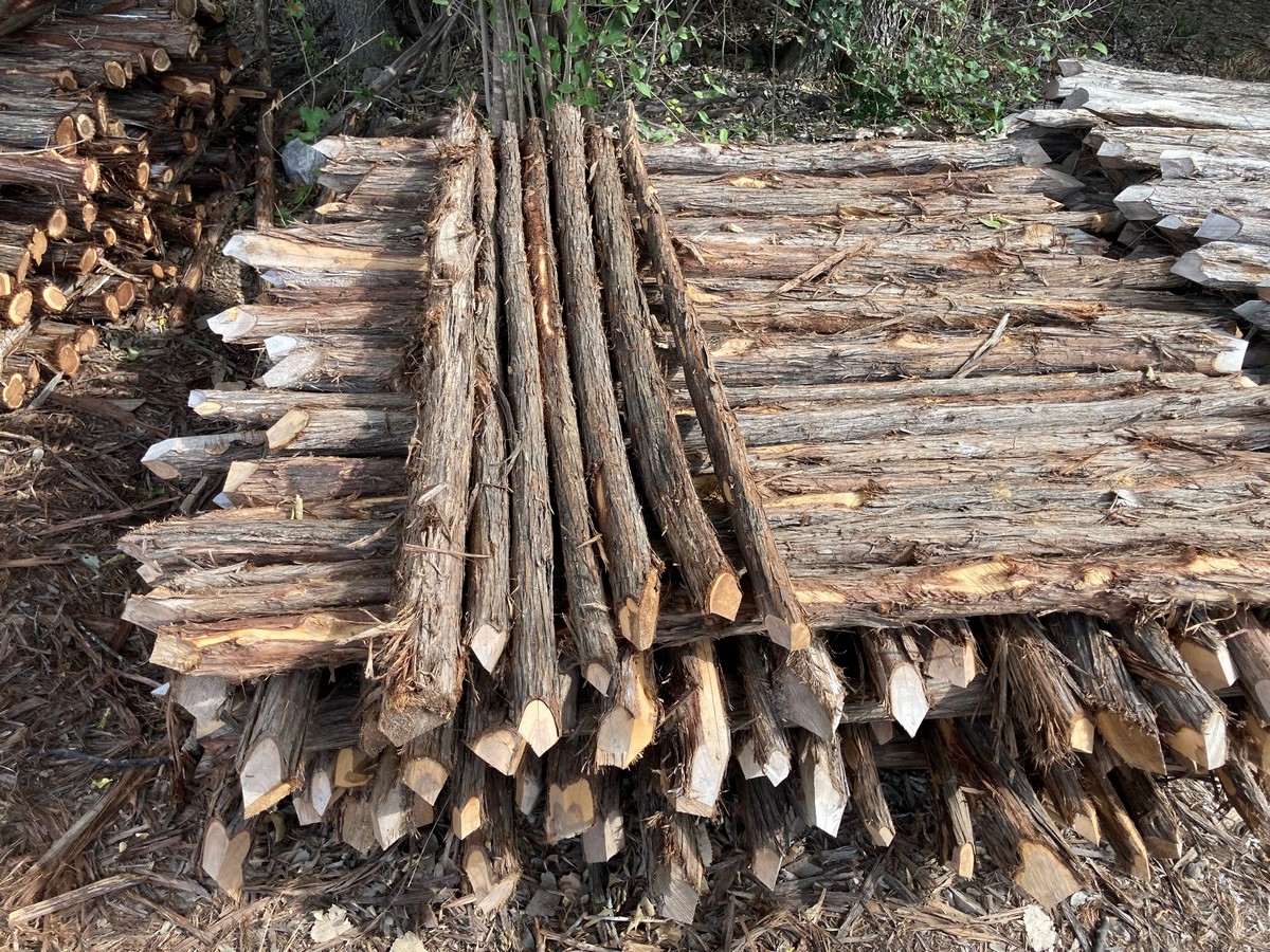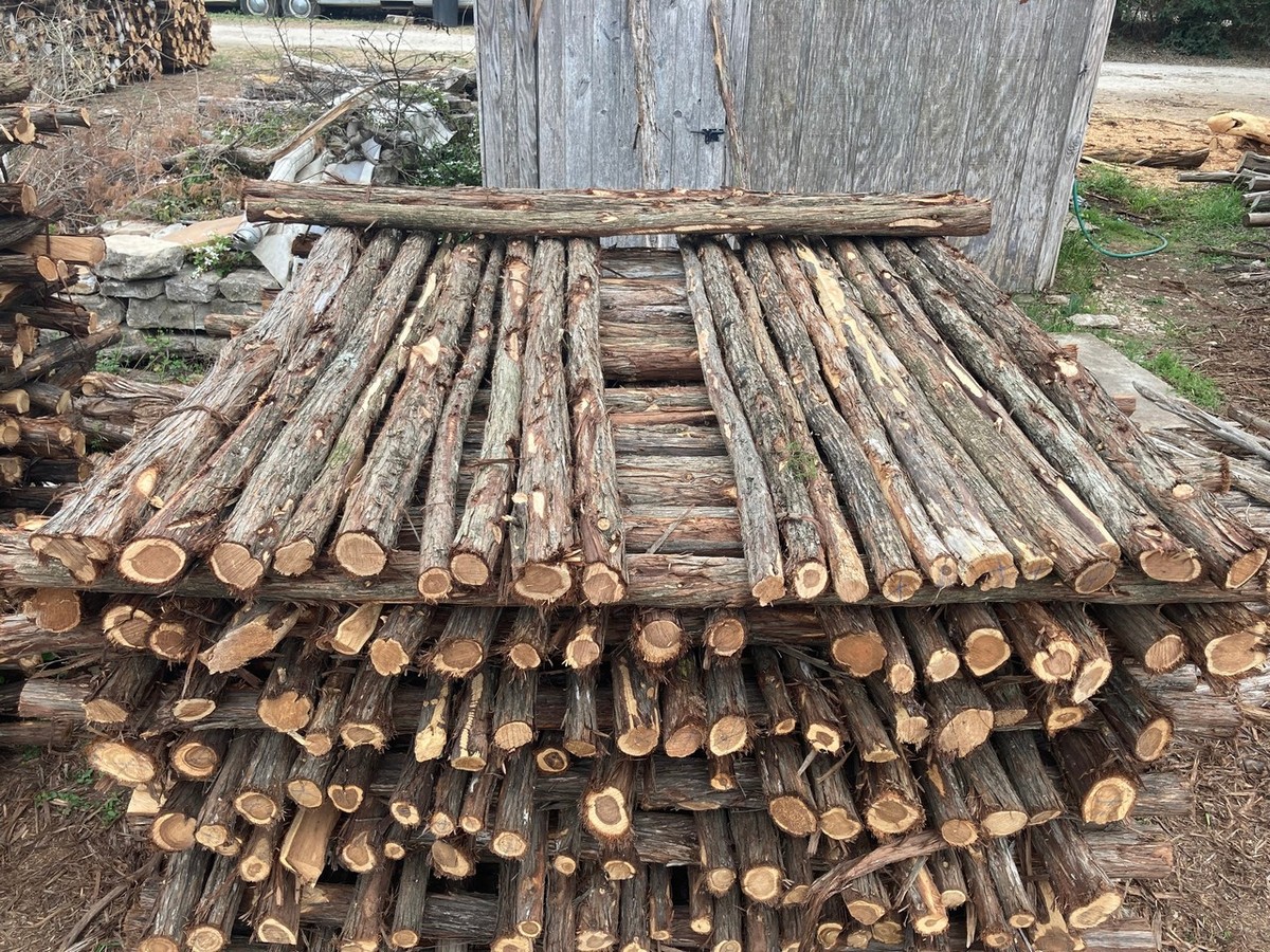 All 5’ staves will range from 1.5-3” in diameter. We do not separate our “bull” staves. Axe-cut staves are pointed with an axe to shed water and add character. #2’s will have a maximum of 3” one-way bow, while #1’s are hand selected for straightness. All 8 1/2’ rails only come in grade #1. |